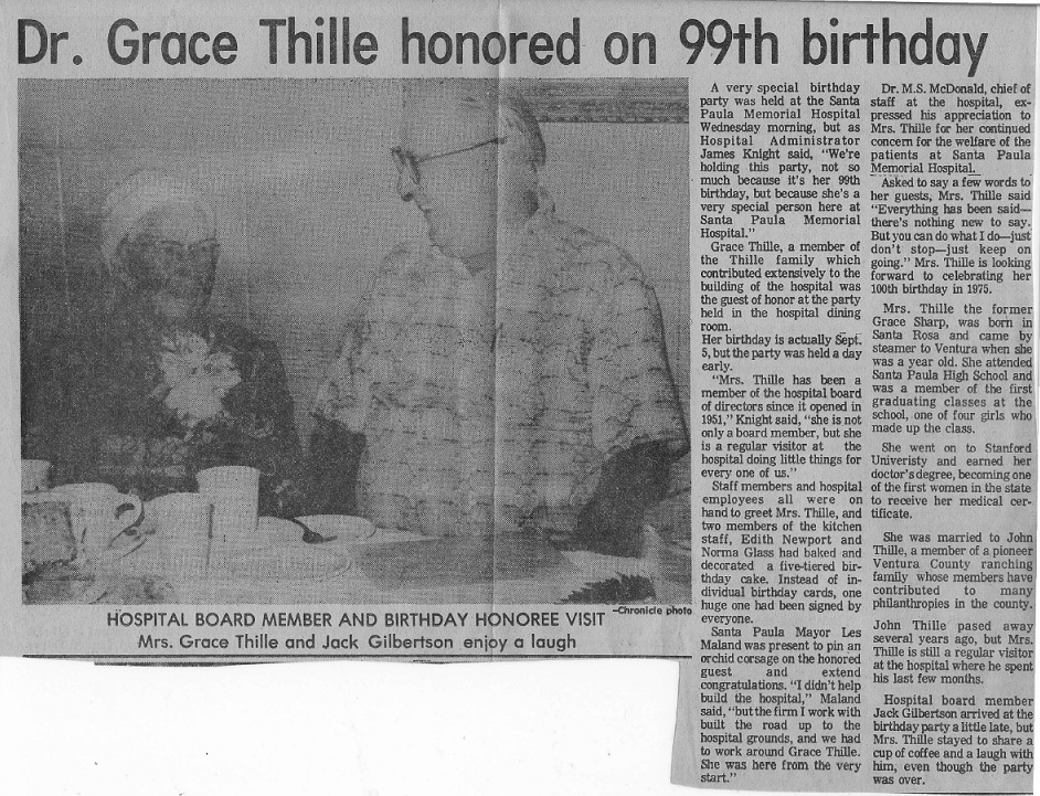 construction of Santa Paula Memorial Hospital. They also contributed to the Catholic Church and Villanova Preparatory School in the Ojai Valley. The Thilles moved into the large Victorian Sharp family house on Telegraph Road